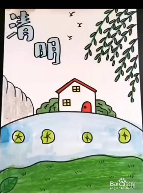 最后,给图片涂上好看的颜色,再用黑色笔画出三只飞鸟,再写出“清明”,并涂上浅蓝色,这样就完成啦啊!