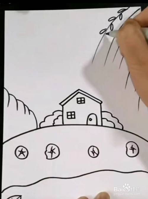 接着,画出一座小房子,注意要画出房顶的厚度,要画出田字格窗户和拱形的大门,再用波浪线画出房子两边的草丛