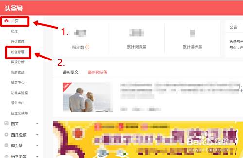 在头条号首页中,点击主页旁边的下三角展开主页,找到粉丝管理。