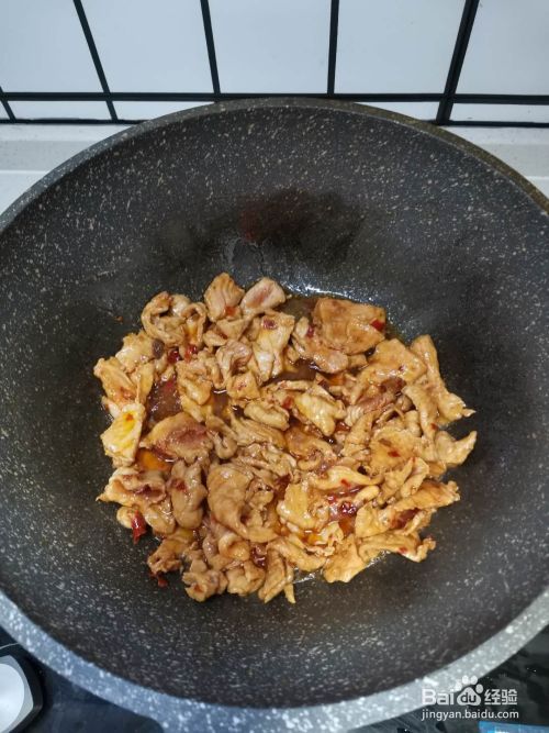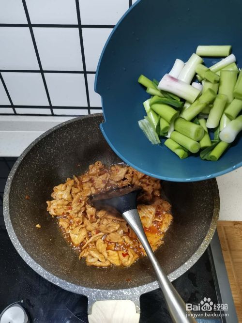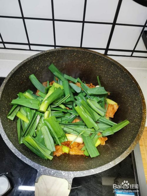 紧接着下蒜苗,并进行翻炒,并加入两勺盐与一勺鸡精。