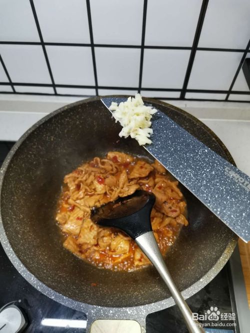 然后起锅下油,下入猪肉翻炒至金黄色。并加入细蒜。