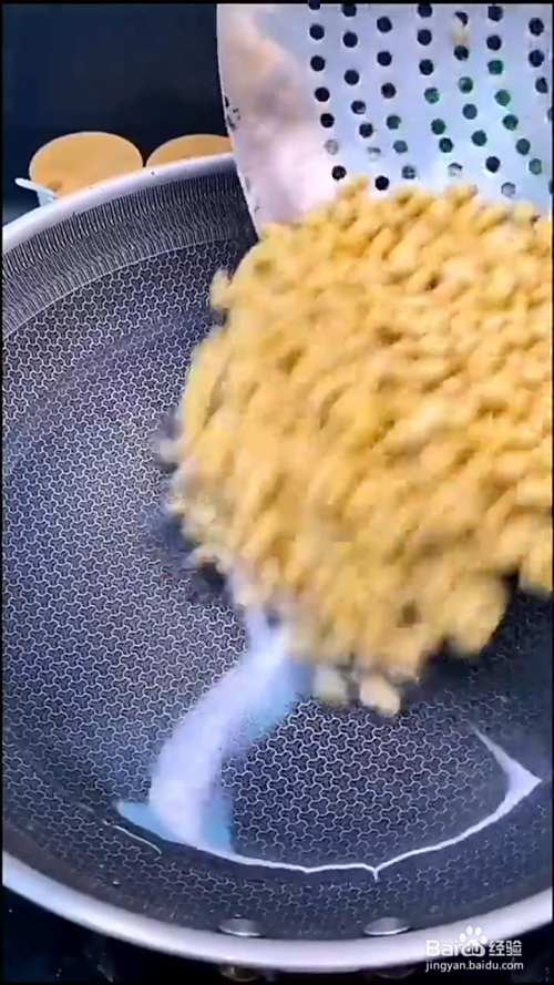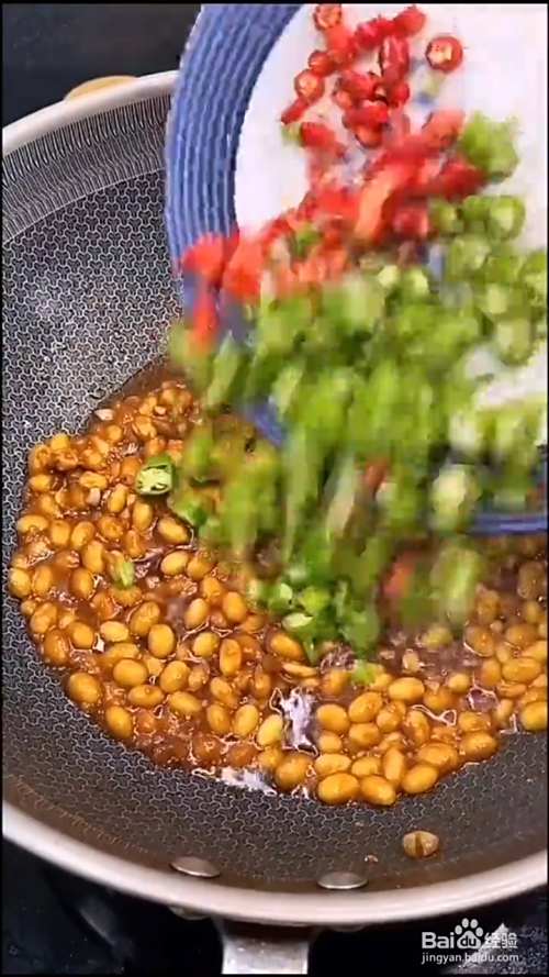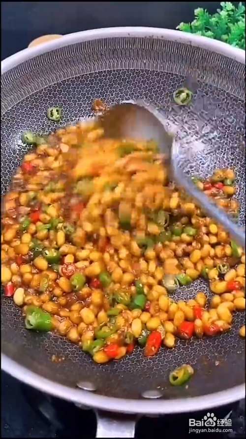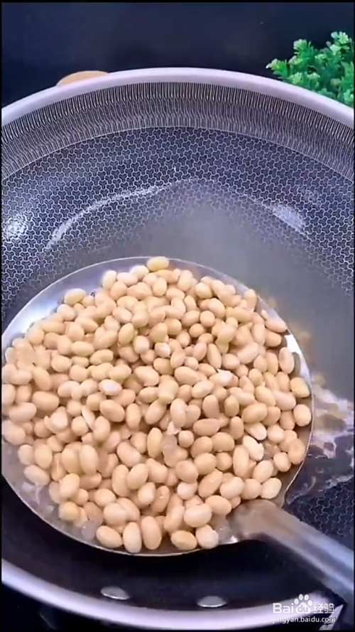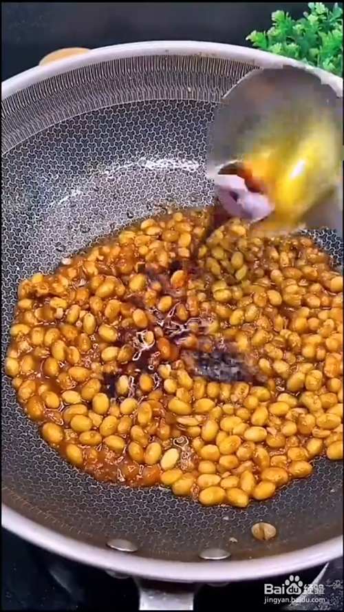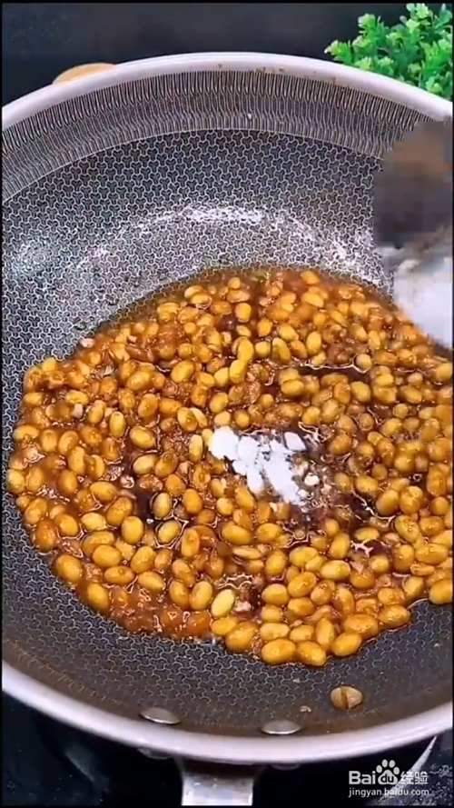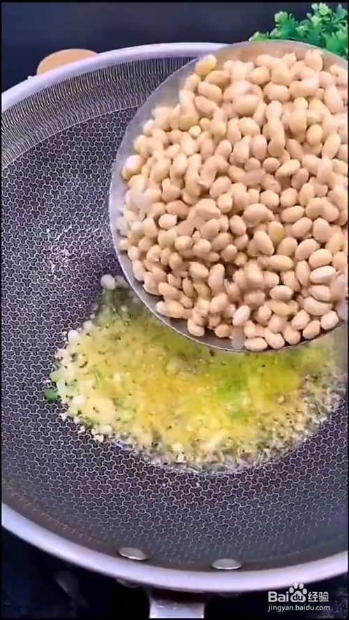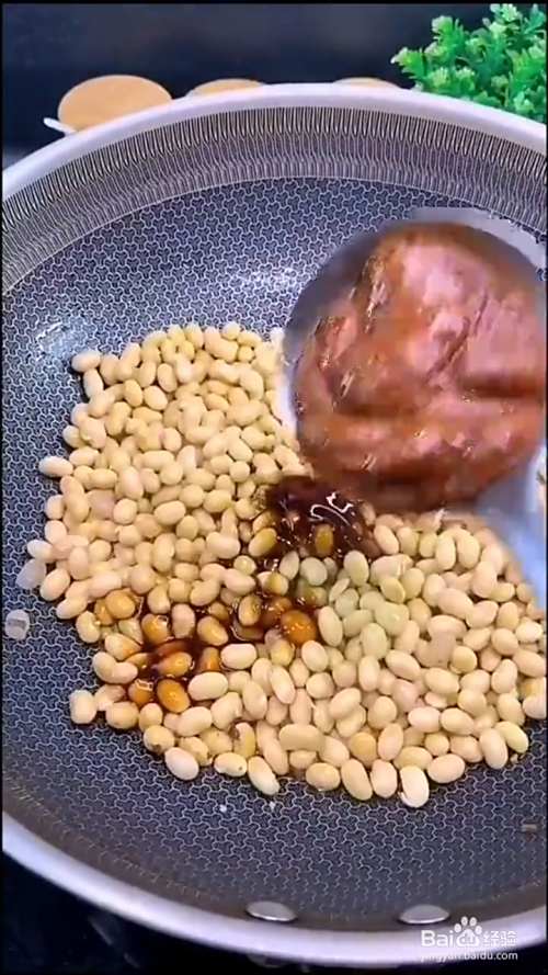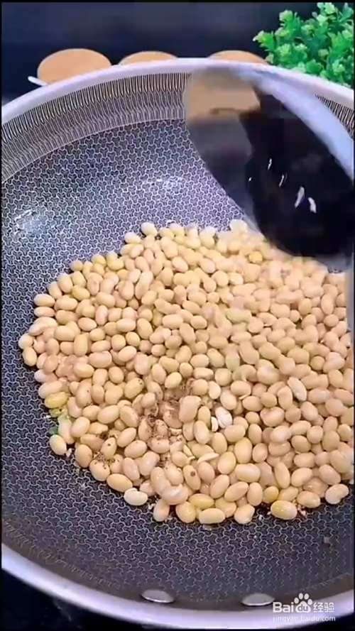 锅中放油 放入葱蒜末炒香 再放入黄豆;