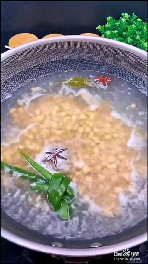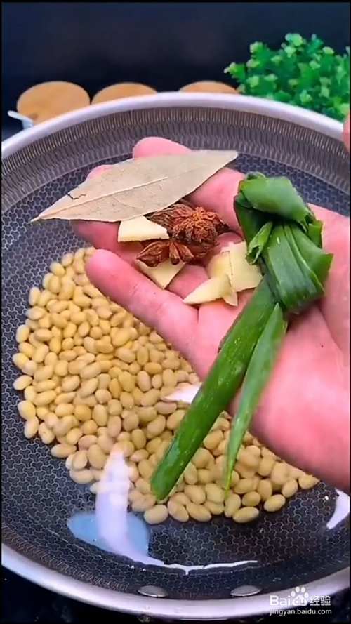 泡好的黄豆冷水下锅 加入葱姜 八角 香叶;