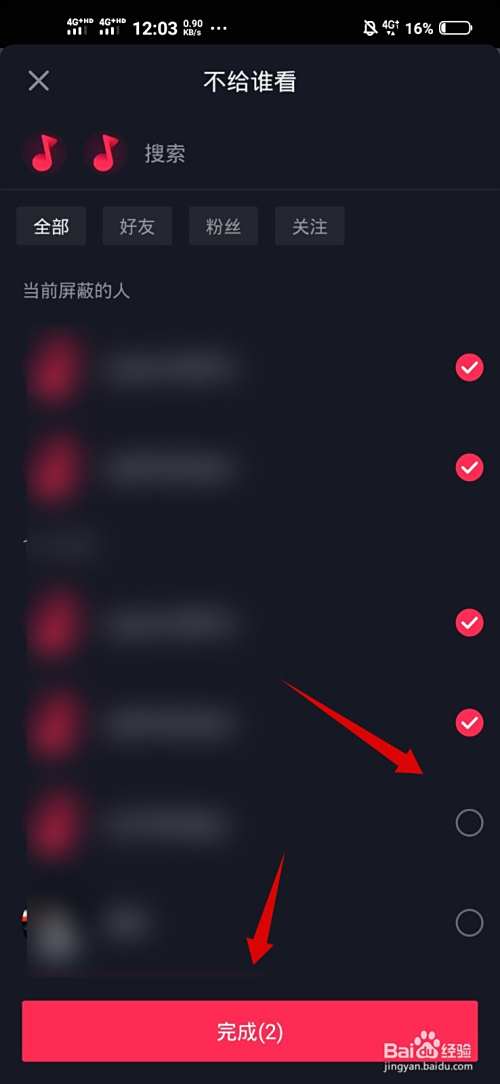 勾选自己的小号点击完成,切换到抖音小号,发现并没有收到通知,但是如果对方已经看过这个作品,你再设置成拒绝他看,他就会发觉;还有一种情况就是,如果他从共同好友的抖音号上看到你的作品,而他自己看不到,就会发觉你已经拒绝他看了。