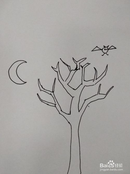 然后在左边大树的旁边的画一个弯弯的月亮。