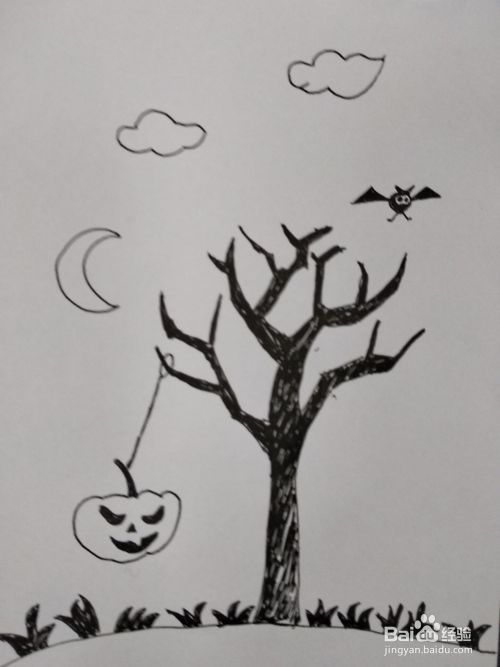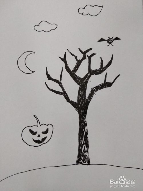 然后在树下画出一条弧线把蝙蝠、大树和南瓜的部分用笔涂黑了,这样显得更恐怖一些。