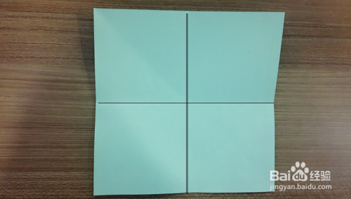 将彩纸边对边对折,展开,出现痕迹,如图两条黑线代表折叠的痕迹
