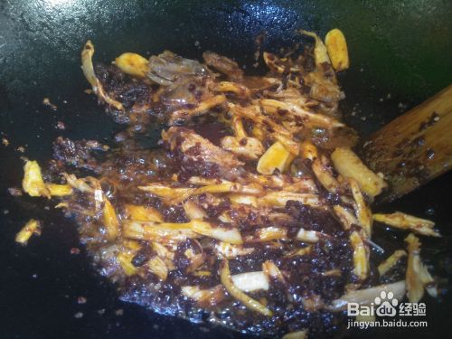 待鸡肉均匀裹上香辣酱后,加入生抽、料酒翻炒片刻。