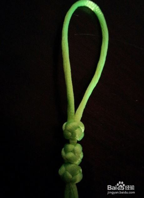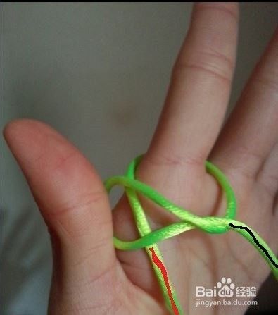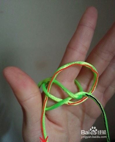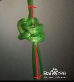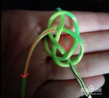 轻轻拉红黑两条线端;得到一个纽扣结的大致形状