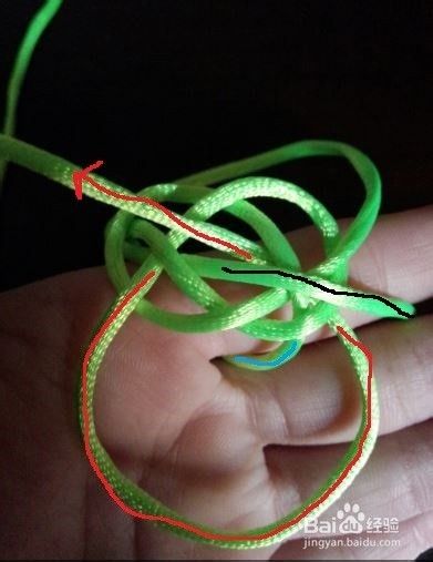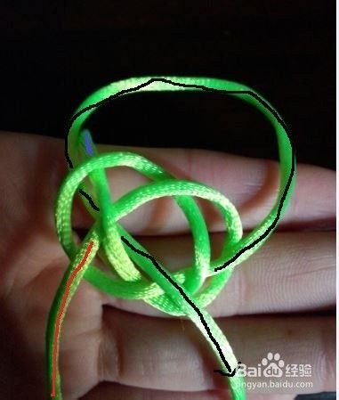 红色标志的线端也逆时针绕一个圈,绕过下端蓝色标志线端,从洞中向外穿出