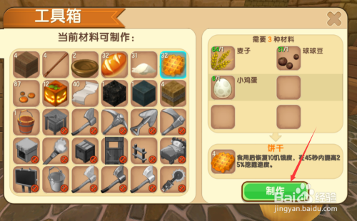 最后使用小鸡蛋,麦子和球球豆合成饼干,如果再有橙色龙舌兰,就能合成更高级的香溢饼干。