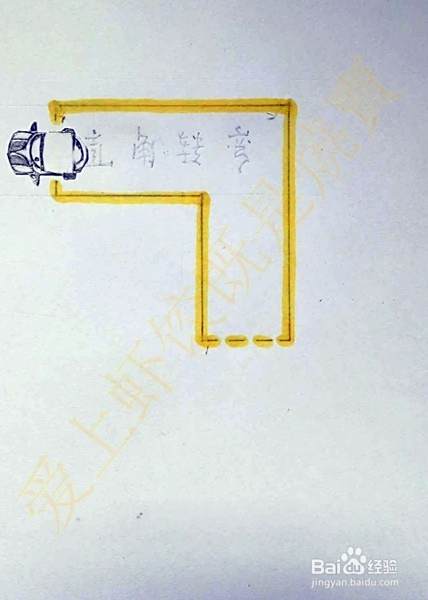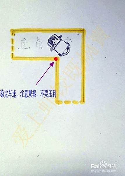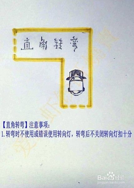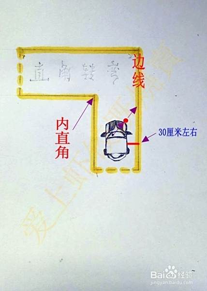 直角转弯一般都是由右向左转弯,在进入直角转弯区域,右侧车身与路边线要保持在30厘米左右的距离,如果距离过近很容易使车在转弯时候车尾角出线;如果距离过宽,在转弯时候就会压到内直角(视线观察到车的右前角与路边线重合时,回正方向保持直行,这时候车身距离边线就是大概30厘米)