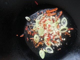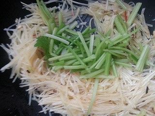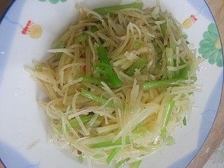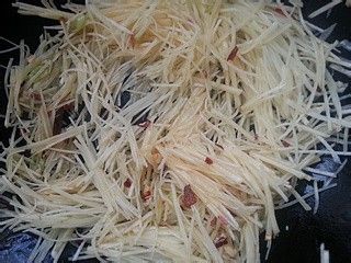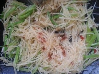 加入土豆丝,翻炒,加以少许的水,防土豆丝粘锅底。