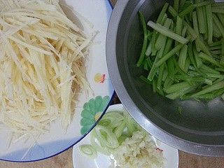切成丝的土豆、芹菜切成和土豆丝差不多长短的段、蒜用刀拍成碎,葱花切小块。
