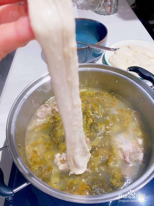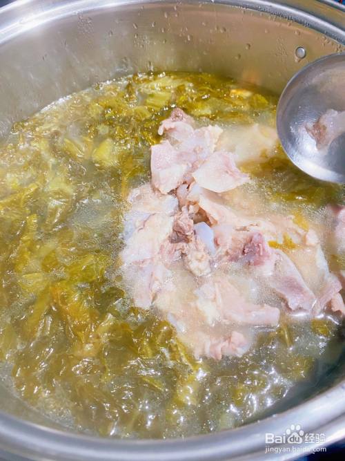 把筒子骨上的拆下来放入汤里一起熬煮5分钟、这时候酸菜的香味出来了