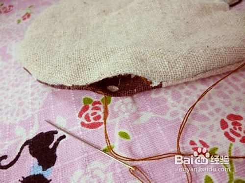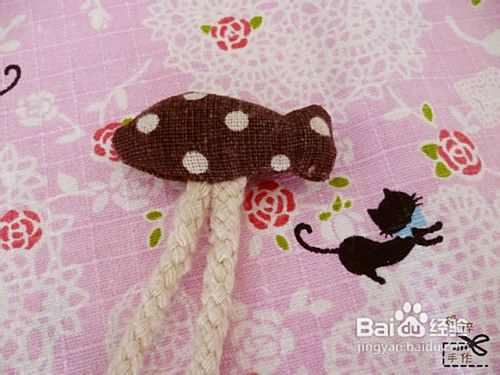 翻过来以后,从小口里塞进棉花,再把棉绳的两头都塞在里面,