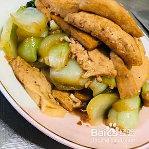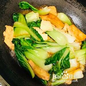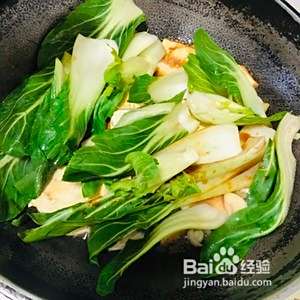豆腐煎好后 把油菜 葱花蒜片 一起扔进去.直接倒入料汁。大火开锅 小火盖锅盖焖两分钟。