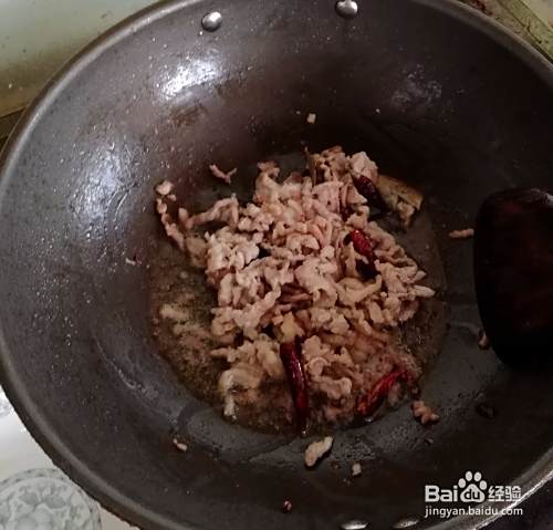 5、放油,油热后放香料,然后放入肉丝