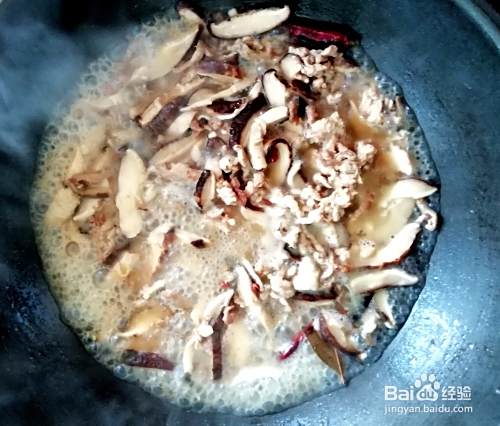 6、、肉丝炒至金黄色,放入香菇煸炒,然后放水,盖上锅盖,等四分钟(水干了)。