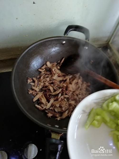 方法:锅中放少量的油,然后放入香料,然后放入肉丝,肉丝炒至金黄色,放入香菇,煸炒后,放入少量的水,盖上锅盖,等四分钟(水没了);然后放入青椒,煸炒后,放入生抽,盐,味精;最后出锅。