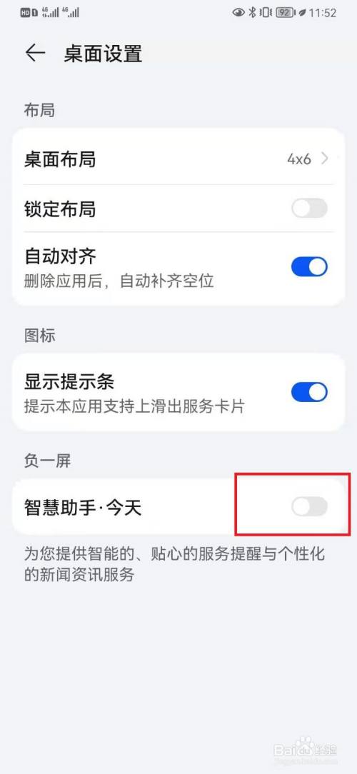 进入桌面设置页面,点击关闭【负一屏】开关后,在华为手机桌面将不显示负一屏的服务号信息。