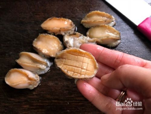 新鲜鲍鱼用牙刷刷干净后,取下鲍鱼肉,再切花刀