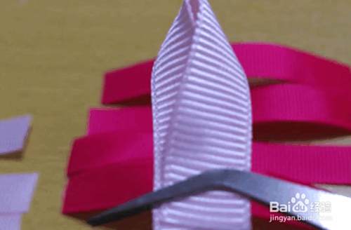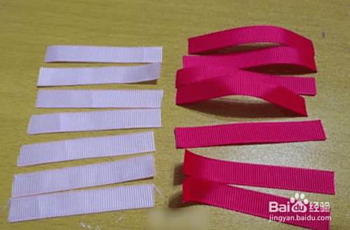 准备粉色和红色缎带,粉色缎带切6厘米,红色缎带切7厘米,都需要7根。