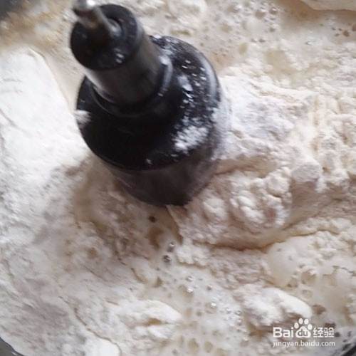 首先在和面机中加入水,泡打粉,酵母,泡打粉是酵母的一半