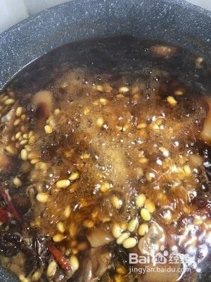 注入开水盖过猪脚,加入黄豆,1勺老抽,2勺酱油,2勺蚝油(用的吃饭的勺子),大火煮开转至中小火炖20分钟,倒入压力锅30分钟,没压力锅的就小火炖1.5小时
