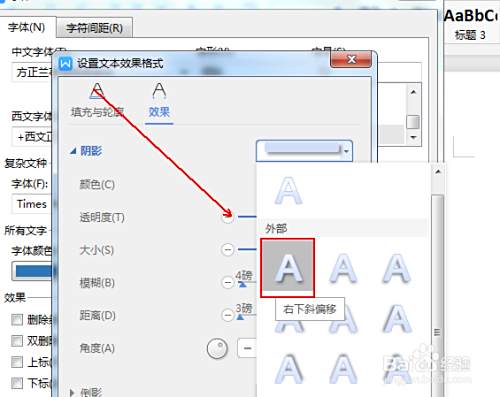 在【效果】中单击【阴影】后面的选项,在弹出的菜单列表中单击【右下斜偏移】选项。