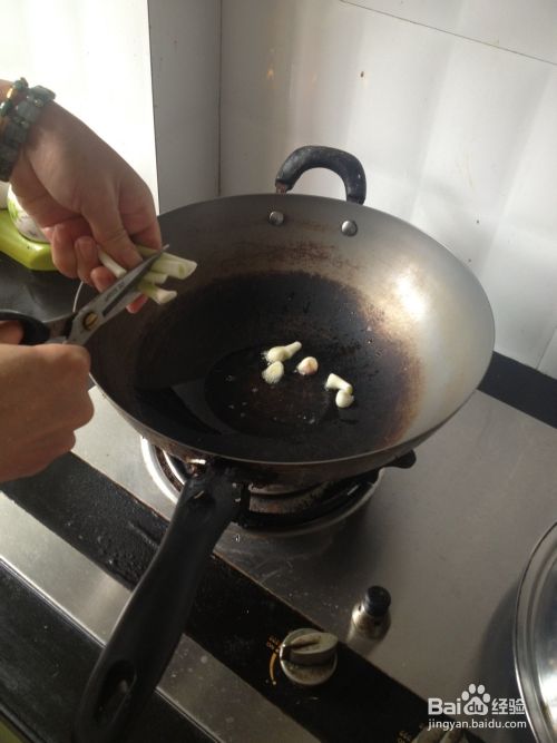 倒入花生油烧热,放入大蒜菜的根部爆香