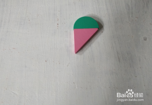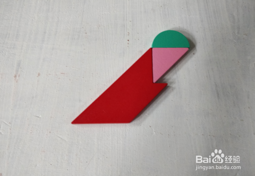 在三角形的左下,放上红色形状挨着,上端一齐,如图。