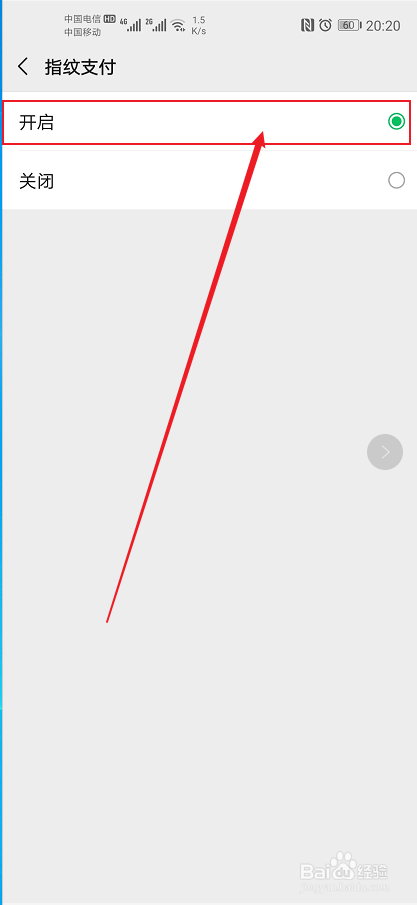 在指纹支付功能内选择“开启”,此时在通过微信进行支付交易时就可以使用支付验证了。