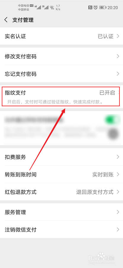 在支付管理界面点击“指纹支付”功能。