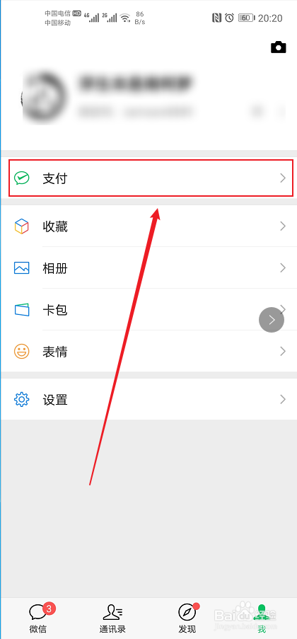 在个人信息面板,点击“支付”,进入支付功能。