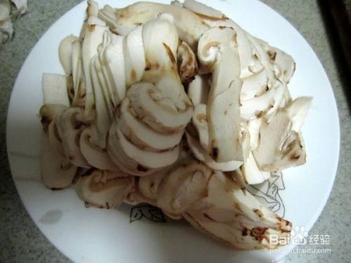 准备新鲜的松茸,切掉根部,清水清洗干净后改刀切片备用