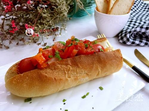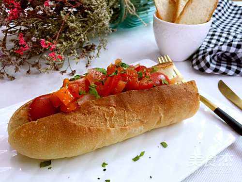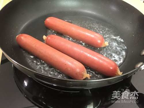 盖上盖子调至中火脾哨,待水蒸发完,热狗肠表皮焦黄时关火 -
