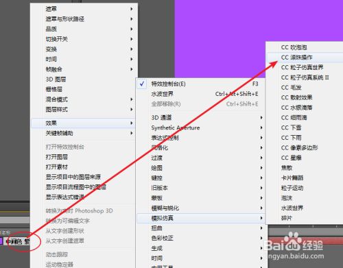 选择固态层,右击鼠标选择“效果>模拟仿真>CC 滚珠操作”,为固态层添加CC 滚珠操作效果。