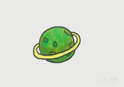 最后涂上颜色,星球涂上绿色,不规则图形涂上深绿色,圆环涂上黄色,一颗水星就画好了。