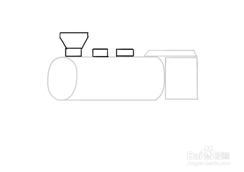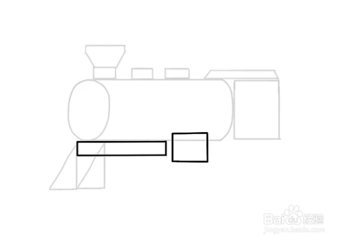 在蒸汽机顶部画三个矩形。在最左边的矩形顶部画一个漏斗。