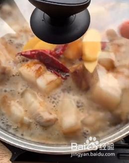 放姜片、干辣椒、红烧料、啤酒,小火炖40分钟
