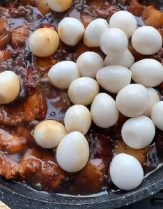 放入煮熟的鹌鹑蛋,再炖五分钟即可,好吃的红烧肉就做好了
