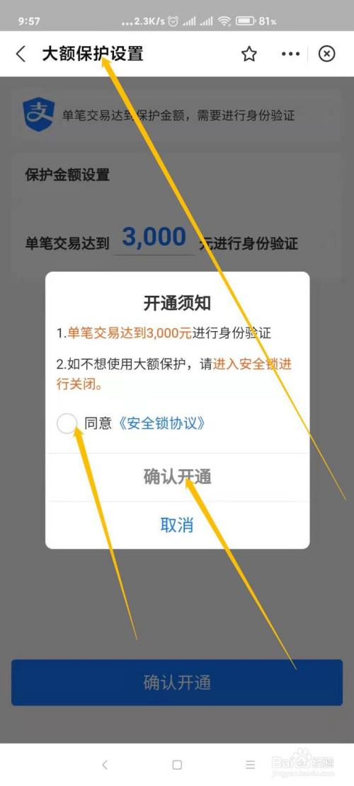点击开启大额保护,点击同意安全锁协议。最后点击确认开通即可。