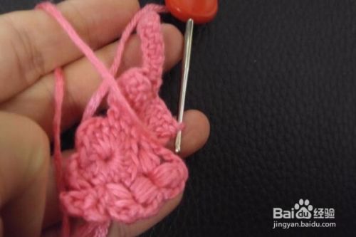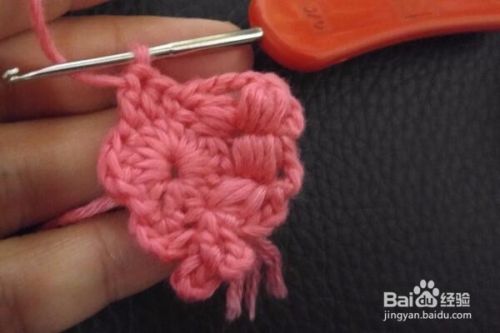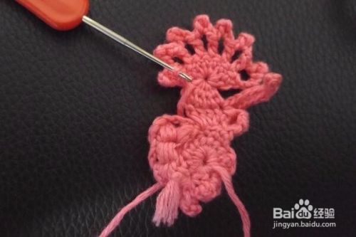 翻过来进行钩织,拉3个辫子针,在立的针目里钩织5长针的爆米花针,然后再拉9个辫子针,返回在倒数第2针的里山开始顺次钩织8个短针,在爆米花针上钩织1个中长针,然后再在下一个中长针上钩2个长针,在下一个短针上也是钩织2个长针。