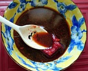 调碗汁: 南乳、南乳汁、生抽、糖放入碗中、碾碎块状,待用。
