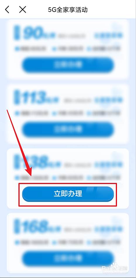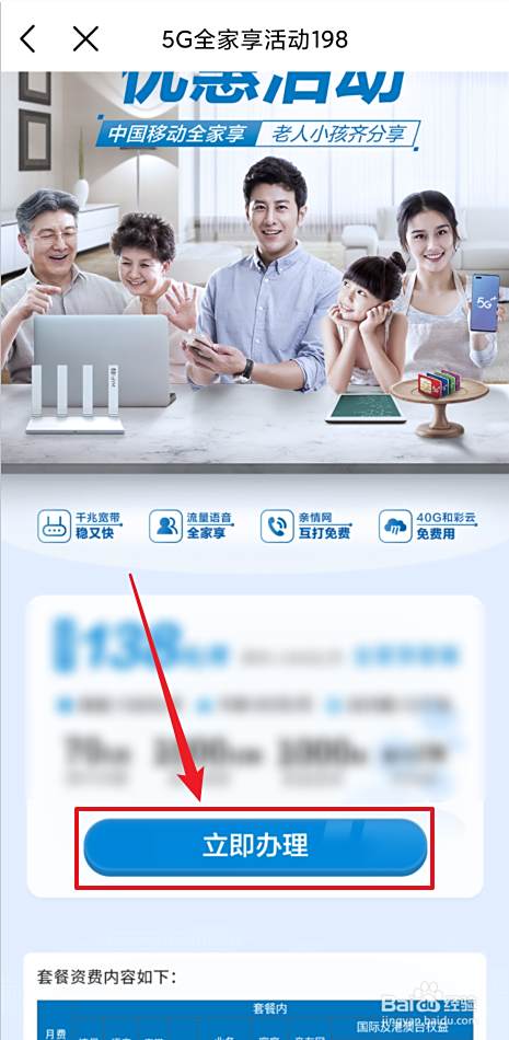 进入5G全家享活动界面后,选择适合自己的套餐并点击该套餐下方【立即办理】按钮。