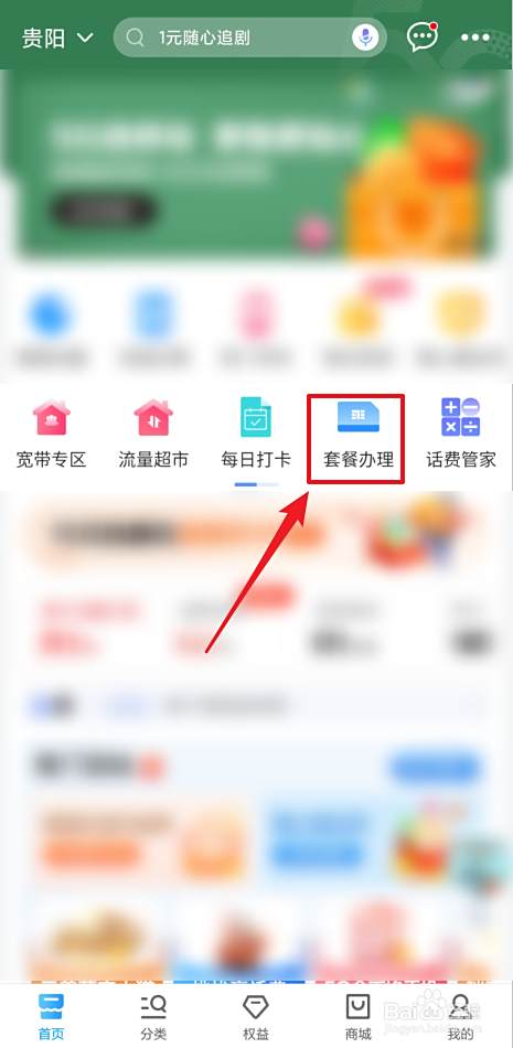 登录【中国移动】后,在首页上点击【套餐办理】。