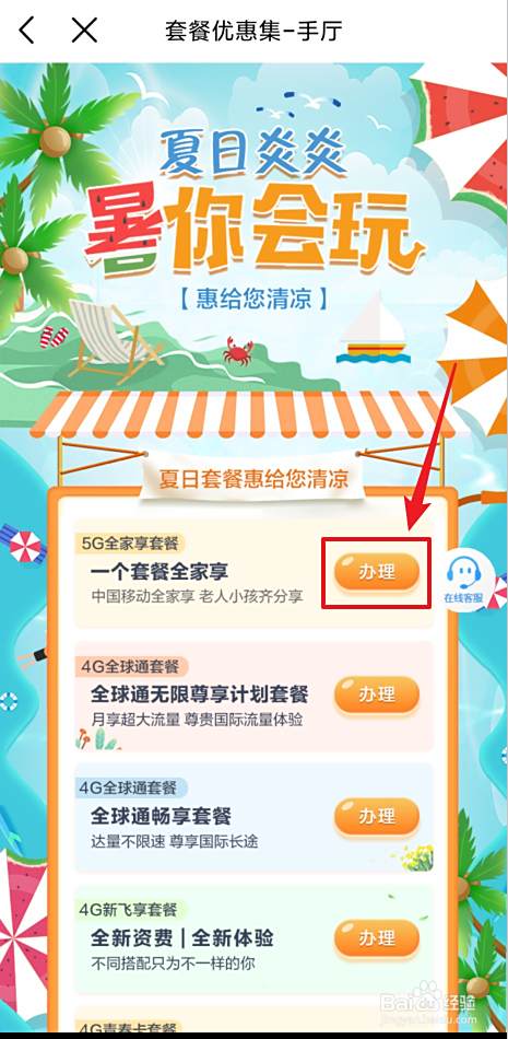 在【套餐优惠集-手厅】界面,点击5G全家享套餐右侧【办理】按钮。