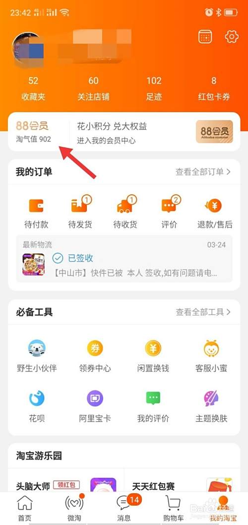 打开手机淘宝,进入个人后台,点击左上角头像下方的淘气值