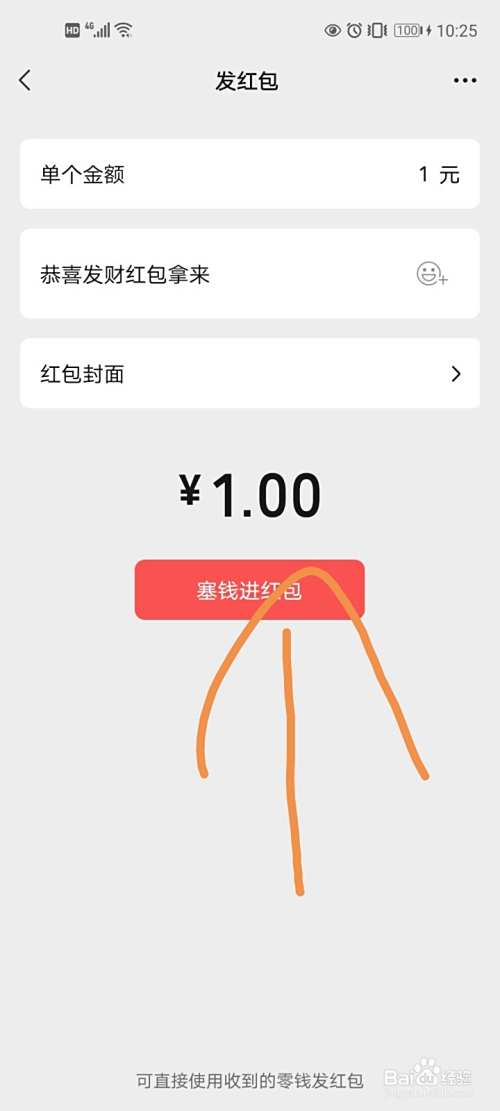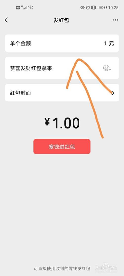 金额输入后,点击下方的“留言”框,在留言框输入问候语、祝福语等自己想写的留言。金额和留言都编辑好后,点击下方的“塞进红包”,这样红包就发出去了。